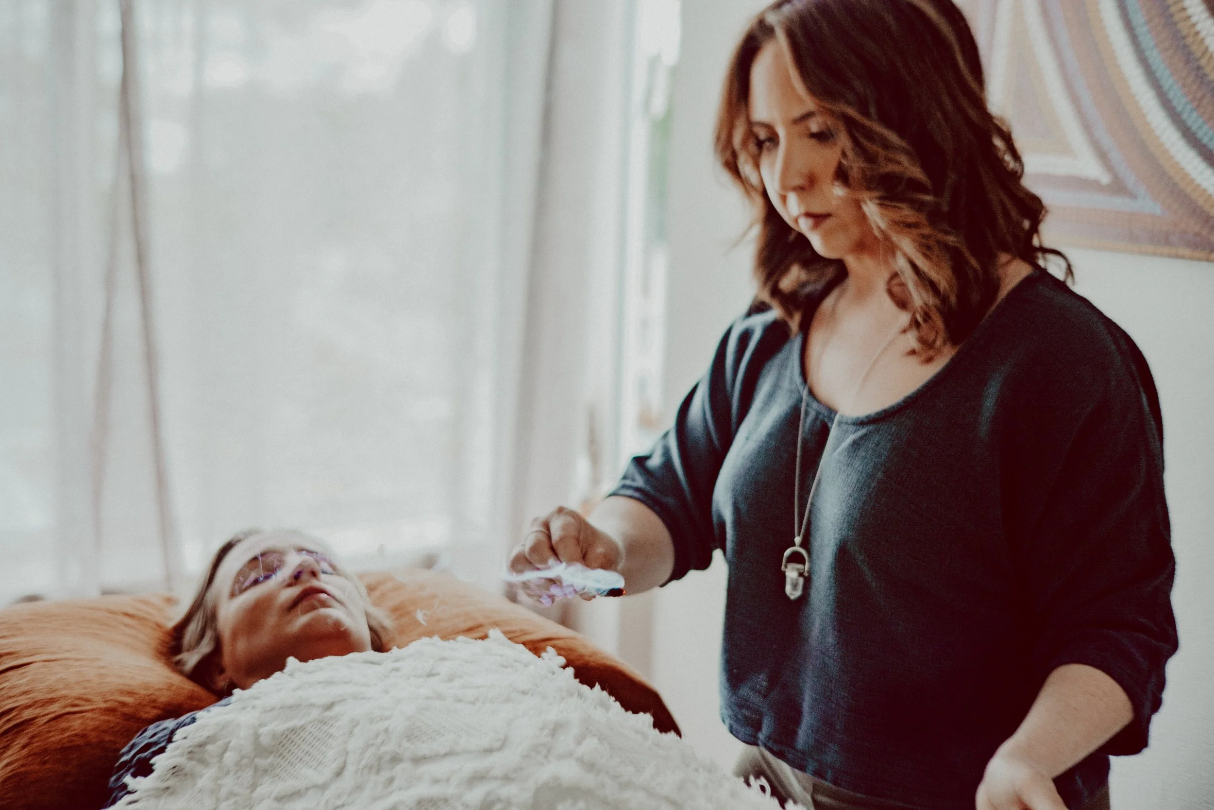 I use weighted tuning forks, vibrational tools, and frequency work to deliver sound directly into your energy body and nervous system. Sound helps re-entrain your brain and body rhythms, shifting you out of disharmony mode and into harmony. (Modern studies show sound can lower cortisol, slow heart rate, shift brainwave states toward calmer frequencies.)